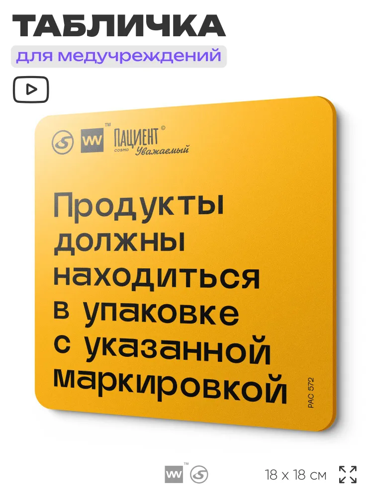 Табличка информационная "Продукты должны находиться в упаковке с указанной маркировкой" для медучреждения, 18х18 см, SilverPlane x Айдентика Технолоджи, пластиковая ПВХ с креплением на самоклеящейся основе, с правилами поведения и соблюдением норм безопасности в медучреждении. Наша табличка-вывеска отлично подойдет как для частной клиники, так и для обычной больницы, поликлиники, медпункта, мед лаборатории или мединститута с большой проходимостью людей. Таблички можно разместить на стену, дверь, зеркало, любую гладкую и даже слегка структурную поверхность. Это легкий способ украсить, обезопасить пространство и проинформировать пациентов вашего медучреждения.