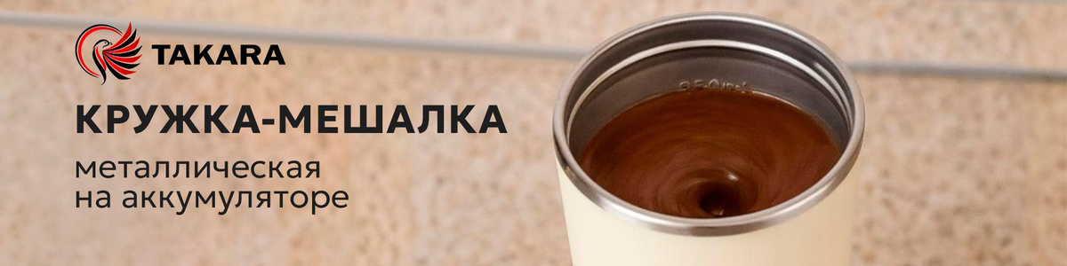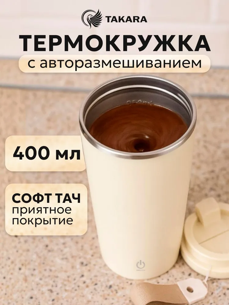 Удобная термокружка с функцией автоматического перемешивания напитка. Подходит для горячих и холодных жидкостей, сохраняет вкус и температуру, исключает необходимость использовать ложку.