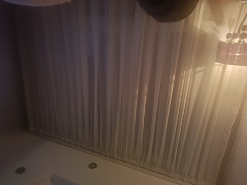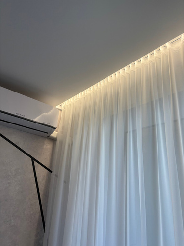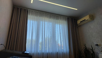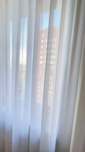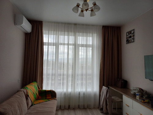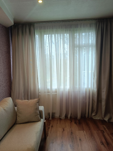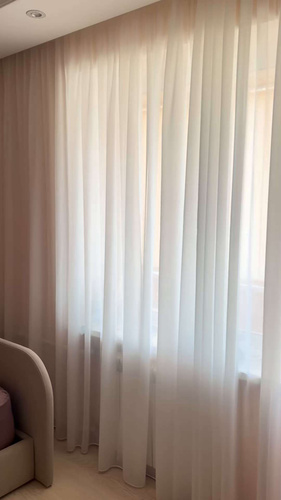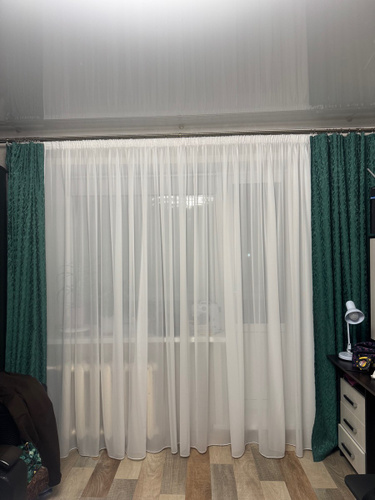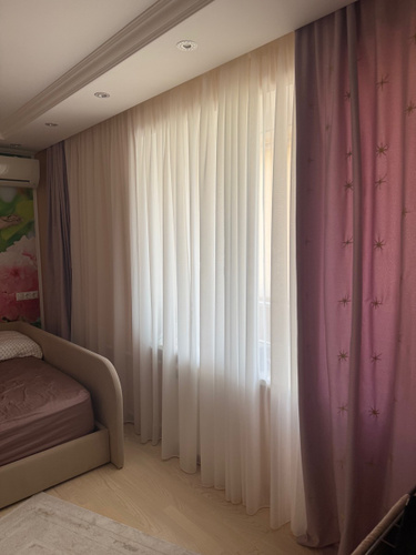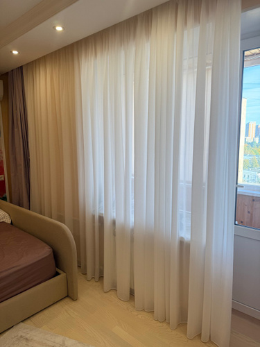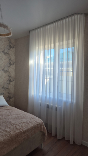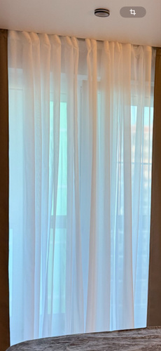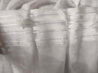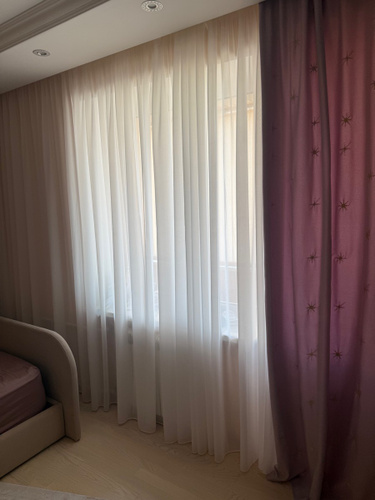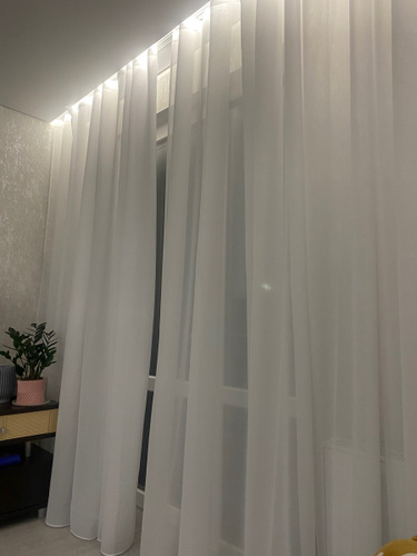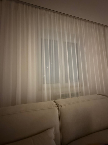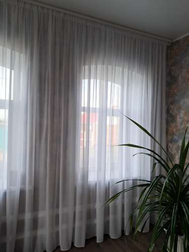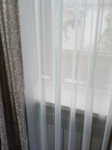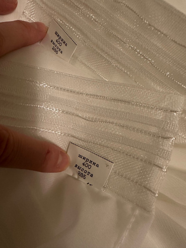 Тюль необыкновенная! С трудом среди других нашли действительно мягкую тюль. Цвет теплый белый очень красивый. Пошив отличный. Не понравилось: ваша бирка вшита вверху и её нельзя убрать из шва, в итоге на одной шторе она прячется за плотной шторой, а на другой осталась на стыковке двух полотен тюли. Не очень красиво получилось.