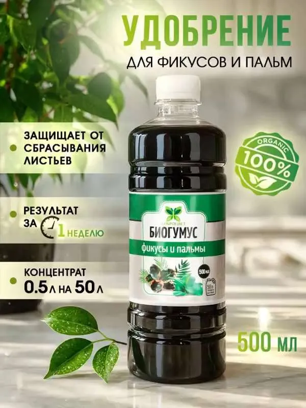Удобрение для комнатных растений "Биогумус для фикусов и пальм" - универсальное жидкое эффективное средство для ухода за живыми цветами в домашних условиях.