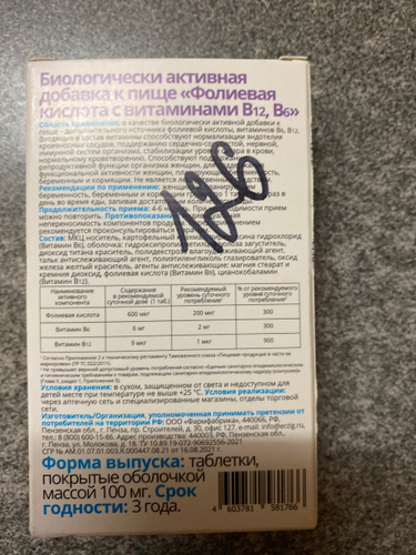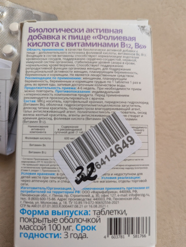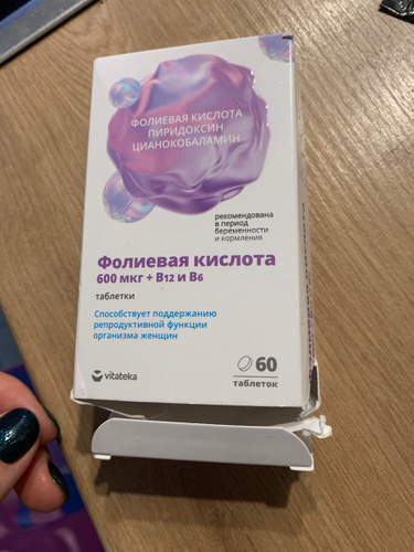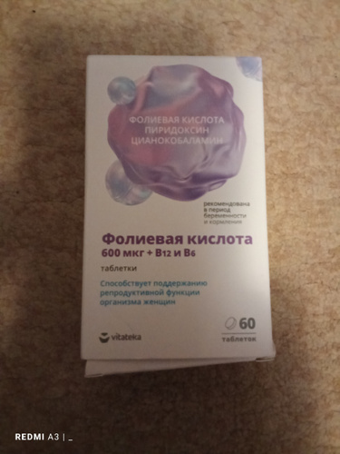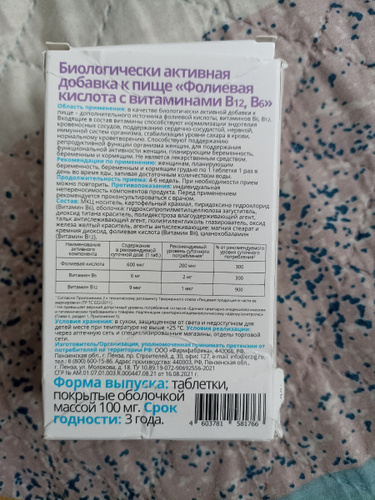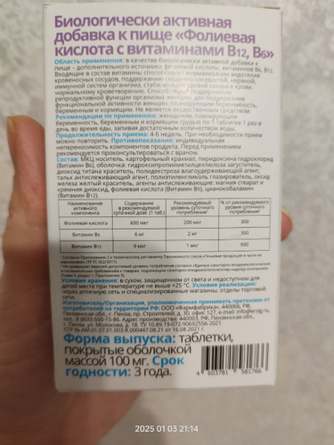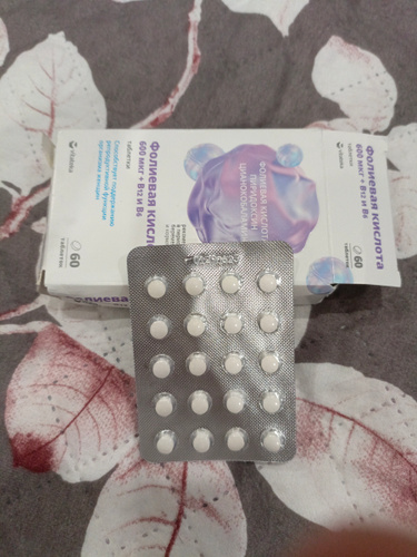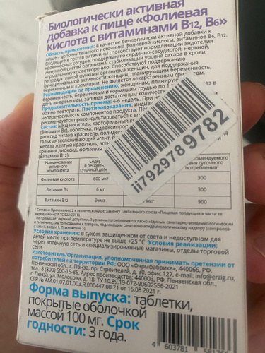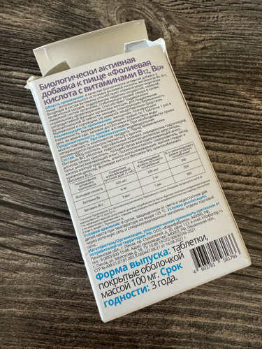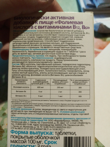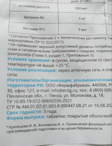 МКЦ носитель, картофельный крахмал, пиридоксина гидрохлорид (Витамин B6), оболочка: гидроксипропилметилцеллюлоза загуститель, диоксид титана краситель, полидекстроза влагоудерживающий агент, тальк антислеживающий агент, полиэтиленгликоль глазирователь, оксид железа желтый краситель, агенты антислеживающие: магния стеарат и кремния диоксид, фолиевая кислота (Витамин B9), цианокобаламин (Витамин B12).