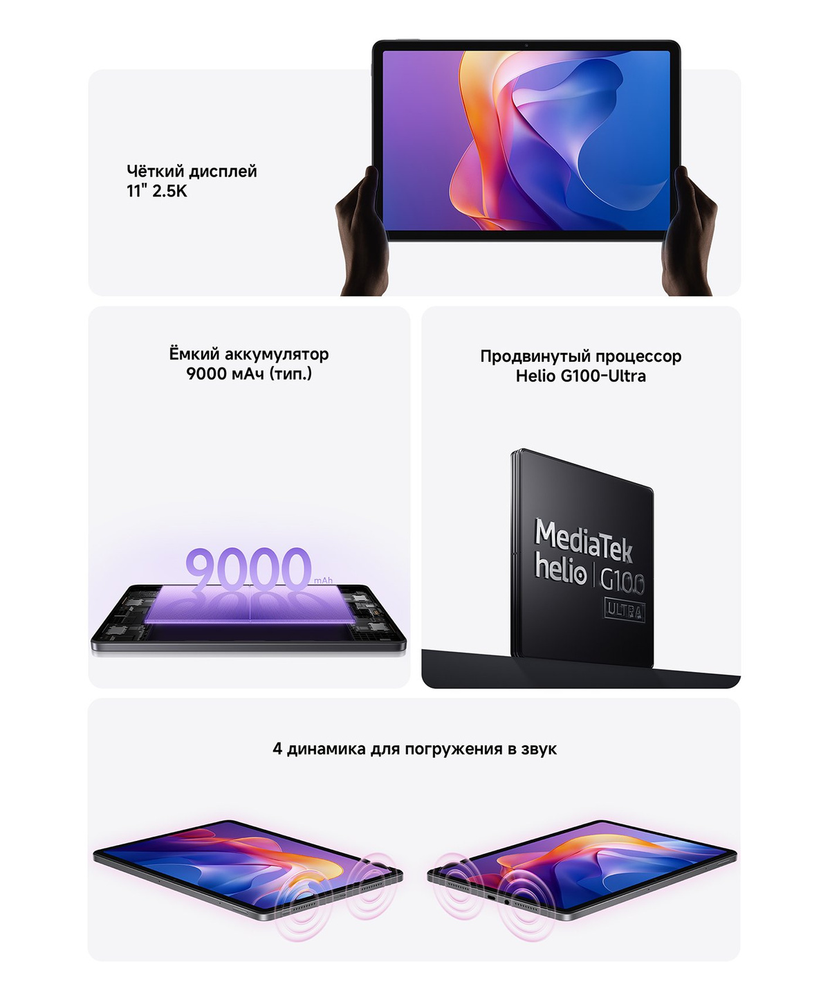 Планшетный компьютер, адаптер, кабель USB Type-C, руководство по быстрому запуску, гарантийный талон, инструмент для извлечения SIM-карты
