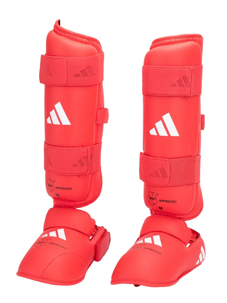 Защита голени и стопы adidas одобренна WKF поставляются парой. (Всемирной Федерацией Каратэ). В основу защиты входит внутренний материал литой пенный вкладыш, который не теряет форму и обеспечивает комфортную посадку по ноге спортсмена, стопа отсоединяется от голени и при желании можно поменять. Удобная фиксация на липучках. Стопа усилена в области большого пальца. Одобрено WKF Одобрено CE Инжекционный литой вкладыш Материал: PU3G Усиленная область большого пальца