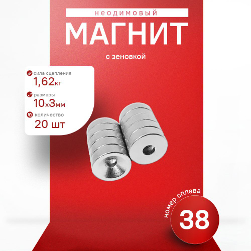 Неодимовый магнит с зенковкой 10х3 мм. с отверстием 20 штук сплав№38