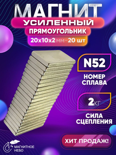 Магнит усиленный прямоугольник 20х10х2 мм - 20 шт, мощный