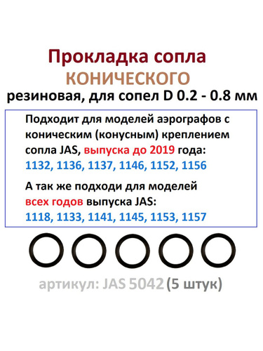 Прокладка сопла конического, 5 шт. JAS 5042 - для аэрографов с конусным соплом, диаметра 0.2-0.8 мм.