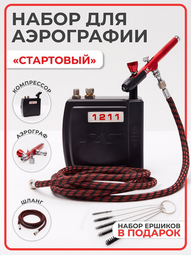 Набор: аэрограф Jas 1174, компрессор Jas 1211, шланг 1401, ёршики для чистки аэрографа