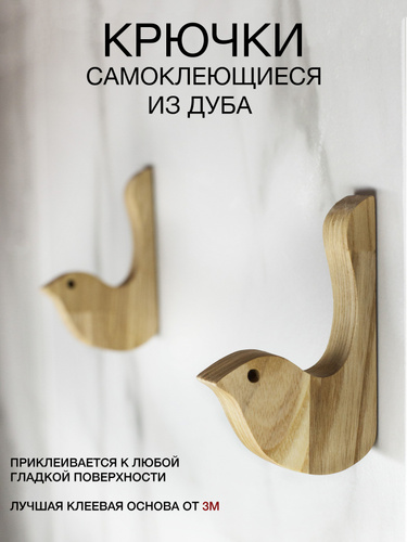 Крючки деревянные настенные для одежды, самоклеющиеся в форме птички 2шт
