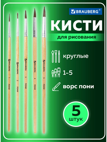 Кисти / кисточки для акварели, гуаши для рисования Brauberg, набор 5 шт. (пони, круглые № 1, 2, 3, 4, 5)
