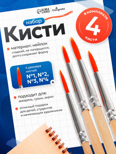 Набор кистей для рисования для школы, нейлон, круглые 4 шт. (№1-4)
