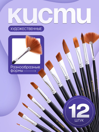 Кисти нейлоновые для рисования 12 штук - кисточки для масляных красок / художественные набор
