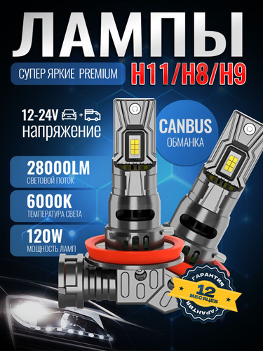 Светодиодные лампы H11 H8 H9 / Premium LED H11 H8 H9 / Авиационный алюминий /супер яркие LED 120W, 6000K