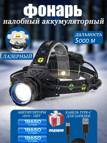 Фонарь налобный аккумуляторный,Авиационный алюминий