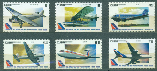 Почтовые марки Авиация, Самолеты "80-летие кубинской авиации" Куба 2009г. MNH