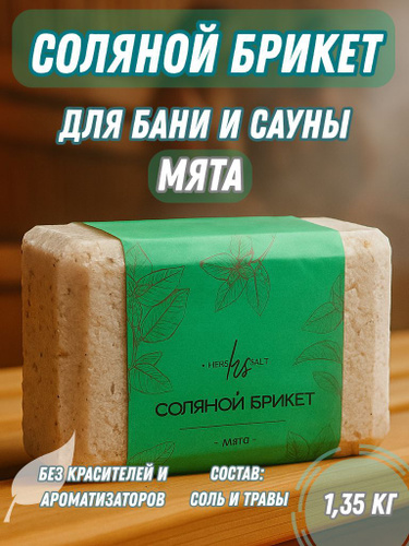 Соляной брикет 1,35кг для бани и сауны с травами "Мята" соль для бани натуральная