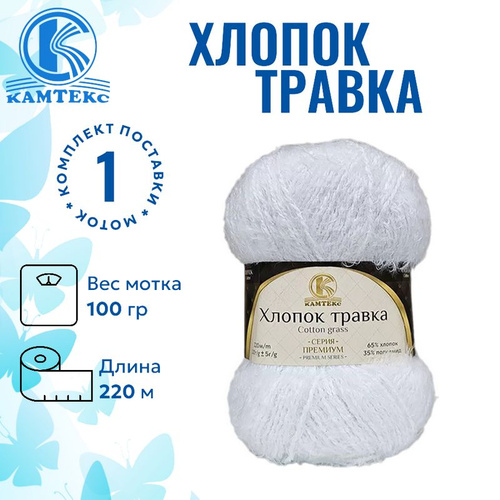 Пряжа для вязания Хлопок-Травка Камтекс белый 205 /1 штука 65% хлопок,35% полиамид 100гр, 220 м
