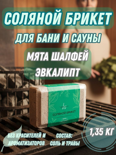 Соляной брикет 1,35кг для бани и сауны с травами "Мята, шалфей, эвкалипт" соль для бани натуральная