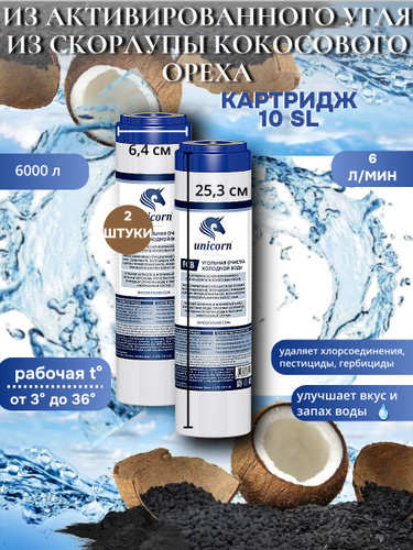 Картридж для фильтра воды с углем из скорлупы кокосового ореха очищает воду от хлора и его соединений, типоразмер 10" SL, производительность 6 л/мин Unicorn FCB 10