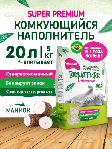 Наполнитель для кошачьего туалета Wisecat Bionature Super Premium комкующийся из маниока, Бразилия 5 кг