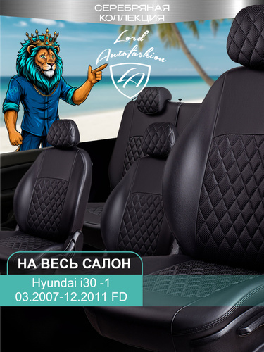 Чехлы на сиденья Хондай Ай30 ФД Лорд Авто 5 мест с 2007 - 2011 Хетчбек / Hyundai i30 FD , на весь салон ( спинка заднего сидения 40/60 раздельная ), экокожа черные Турин Ромб