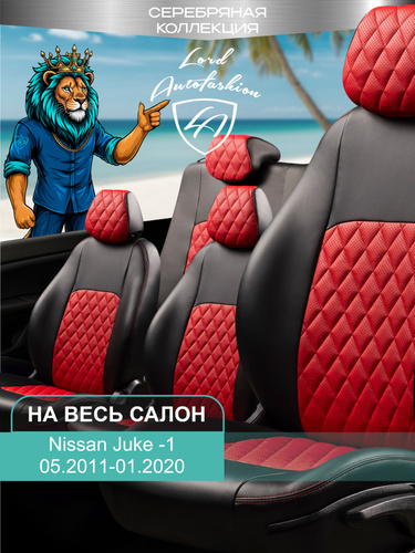 Чехлы на сиденья Ниссан Жук УФ15 Лорд Авто 5 мест с 2011 - 2020 Кроссовер / Nissan Juke YF15 на весь салон ( спинка заднего сидения 60/40 раздельная ), экокожа черные красные Турин Ромб